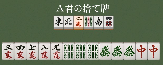 上図は2マン、5マンのリャンメン待ちですが、A君はすでにアガリ牌である2万を捨てているので、他家から2マンはもちろん、5マンが捨てられてもロンあがりすることはできません。